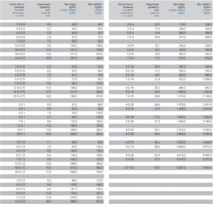 | Артикул | Название | Информация | Диаметр | Размеры | Вес меди | Вес кабеля |