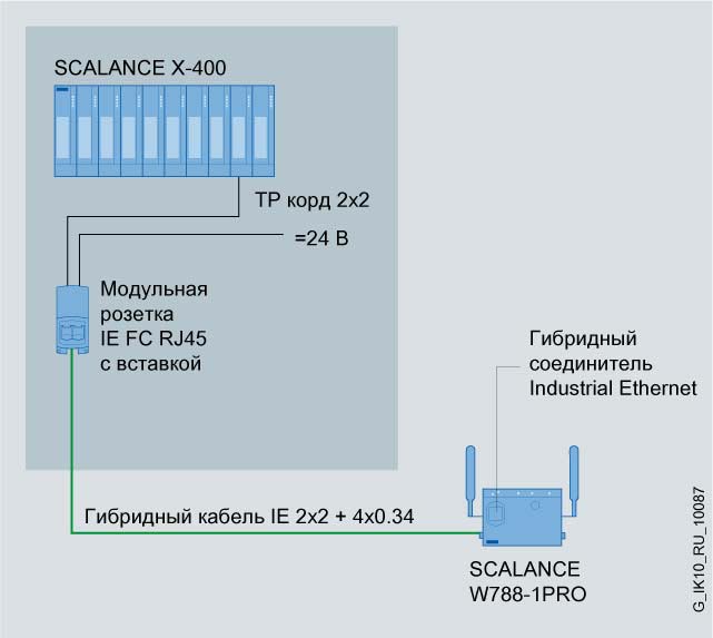 IE гибридный кабель 2x2 + 4x0.34 и IE FC RJ45 модульная розетка с подключением питания могут быть использованы для подключения удаленных станций (например, точек доступа SCALANCE W) одновременно к данным (10/100 Мбит/сек) и питанию. Стоимость монтажа может быть значительно снижена, т.к. данные и питание передаются через общий кабель.