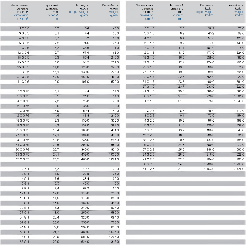 | Артикул | Название | Информация | Диаметр | Размеры | Вес меди | Вес кабеля |