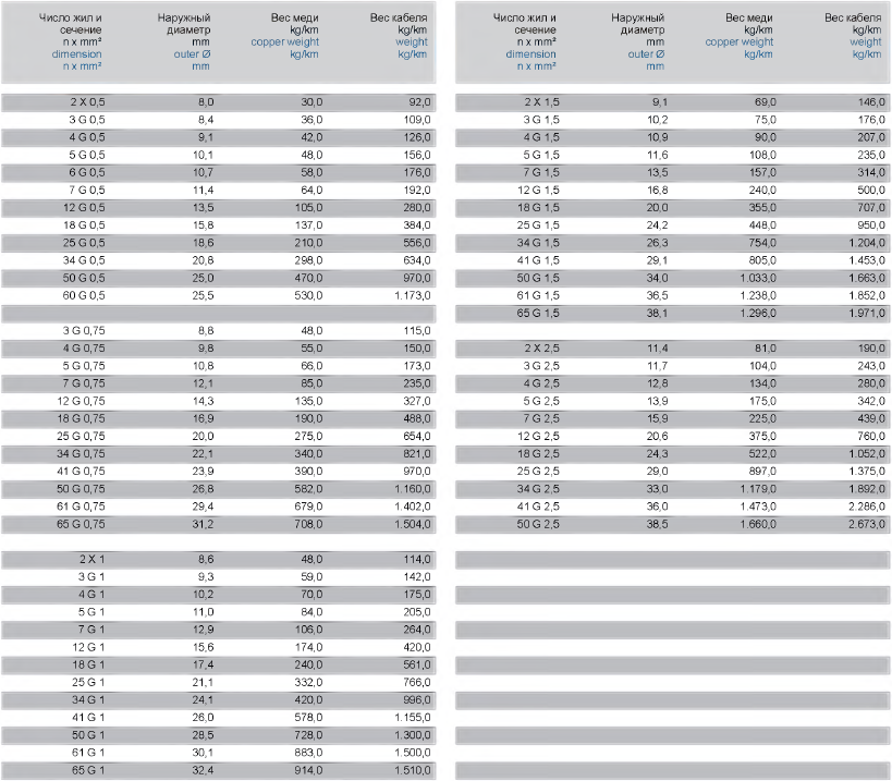 | Артикул | Название | Информация | Диаметр | Размеры | Вес меди | Вес кабеля |