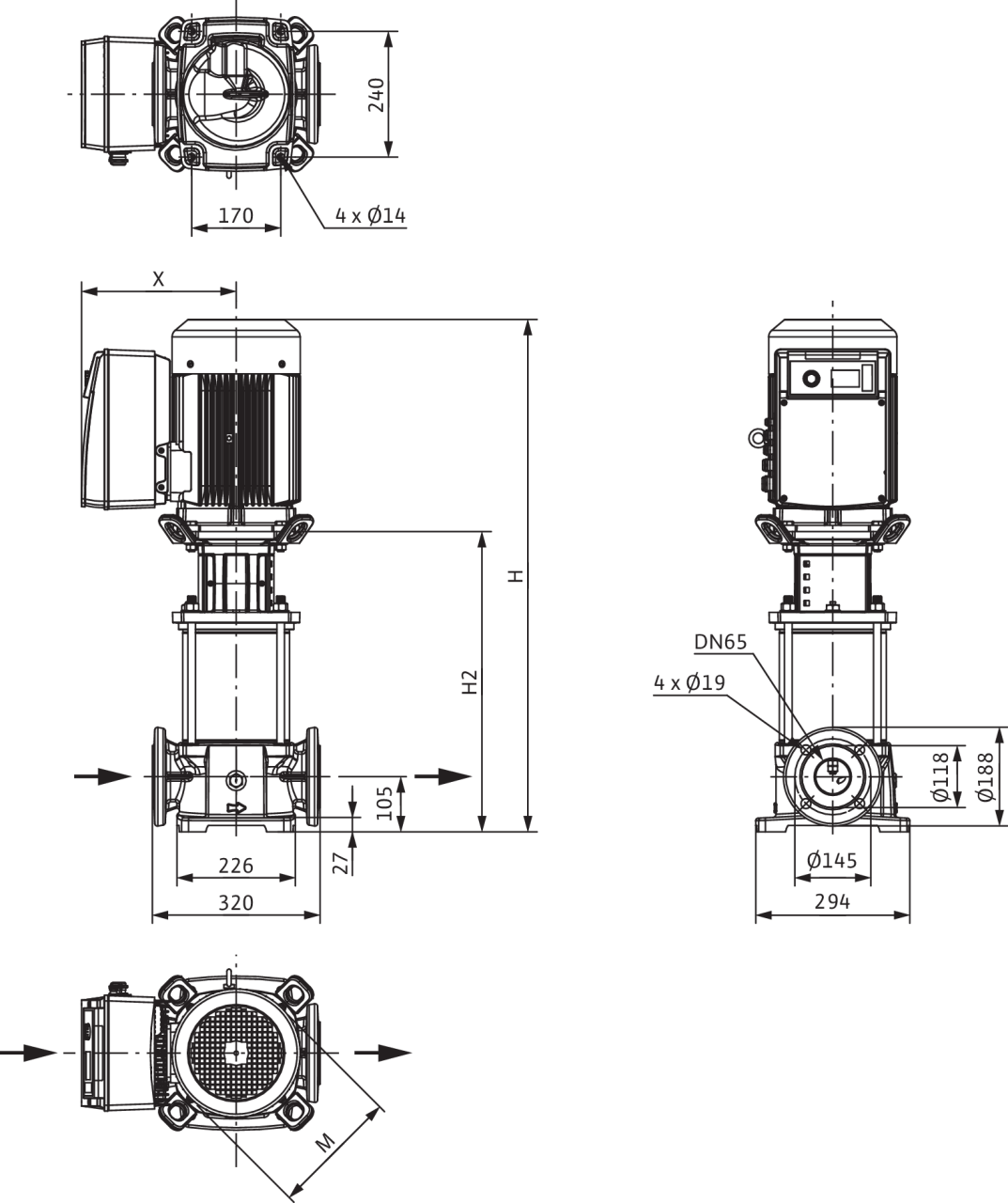 Высокоэффективный высоконапорный центробежный насос вертикального исполнения с линейными подсоединениями, электродвигателем класса IE4 согласно IEC и с встроенным частотным преобразователем с воздушным охлаждением. Встроенный частотный преобразователь позволяет осуществлять плавную регулировку частоты вращения, давления и ПИД-регулировку.