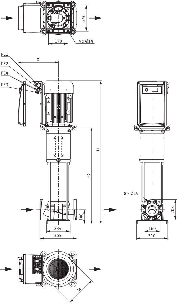 Высокоэффективный высоконапорный центробежный насос вертикального исполнения с линейными подсоединениями, электродвигателем класса IE4 согласно IEC и с встроенным частотным преобразователем с воздушным охлаждением. Встроенный частотный преобразователь позволяет осуществлять плавную регулировку частоты вращения, давления и ПИД-регулировку.