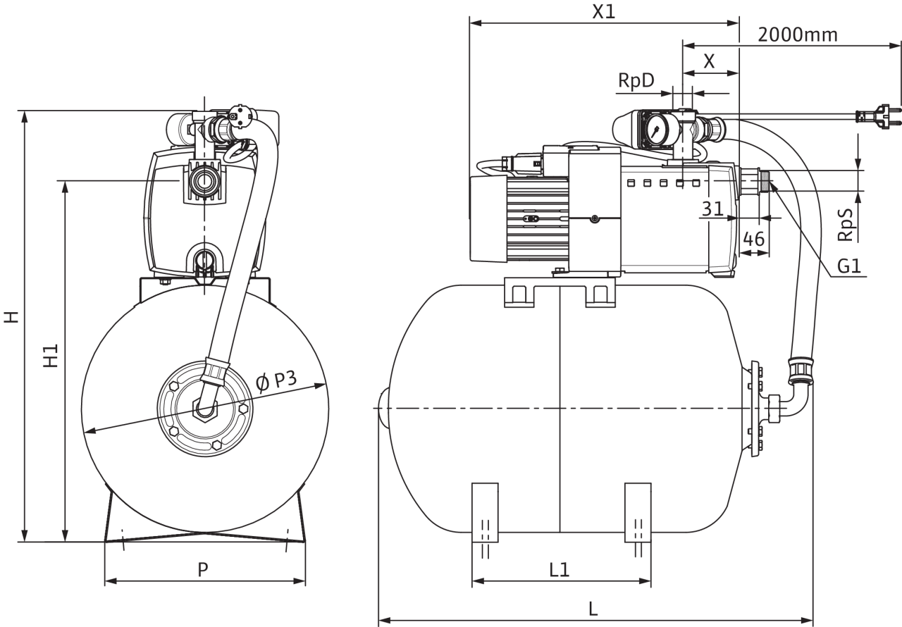 Готовый смонтированный блок с электропроводкой, состоящий из многоступенчатого горизонтального центробежного насоса с сухим ротором, не самовсасывающего, с непосредственно прифланцованным электродвигателем (не требующее техобслуживания скользящее торцовое уплотнение в месте прохода вала), а также мембранным напорным баком.