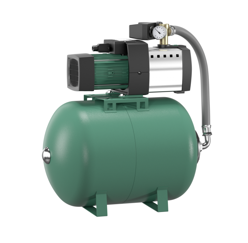 Готовый смонтированный блок с электропроводкой, состоящий из многоступенчатого горизонтального центробежного насоса с сухим ротором, не самовсасывающего, с непосредственно прифланцованным электродвигателем (не требующее техобслуживания скользящее торцовое уплотнение в месте прохода вала), а также мембранным напорным баком.