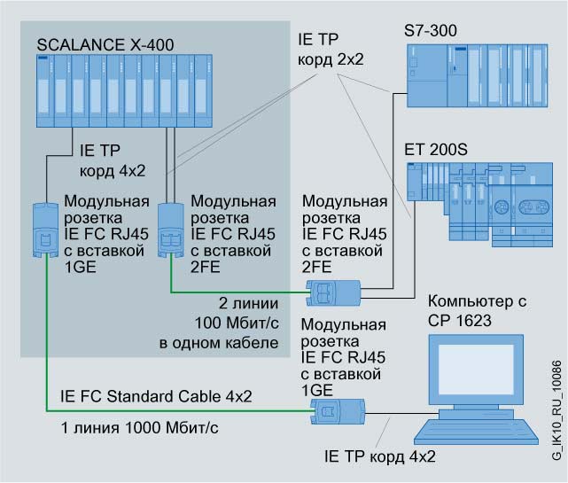 Конфигурация системы с использованием IE FC RJ45 модульной розетки 100 Mбит/сек и 1000 Mбит/сек