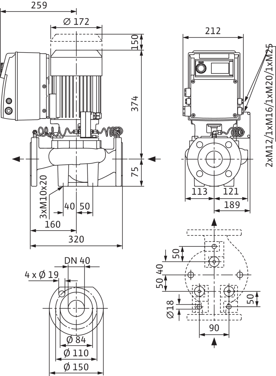 Центробежный насос с сухим ротором линейного типа для установки в трубах или на фундаменте со встроенным частотным преобразователем для электронного регулирования параметров, в том числе постоянного или переменного перепада давления (Δp-c/Δp-v). Трехфазный электродвигатель с частотным преобразователем