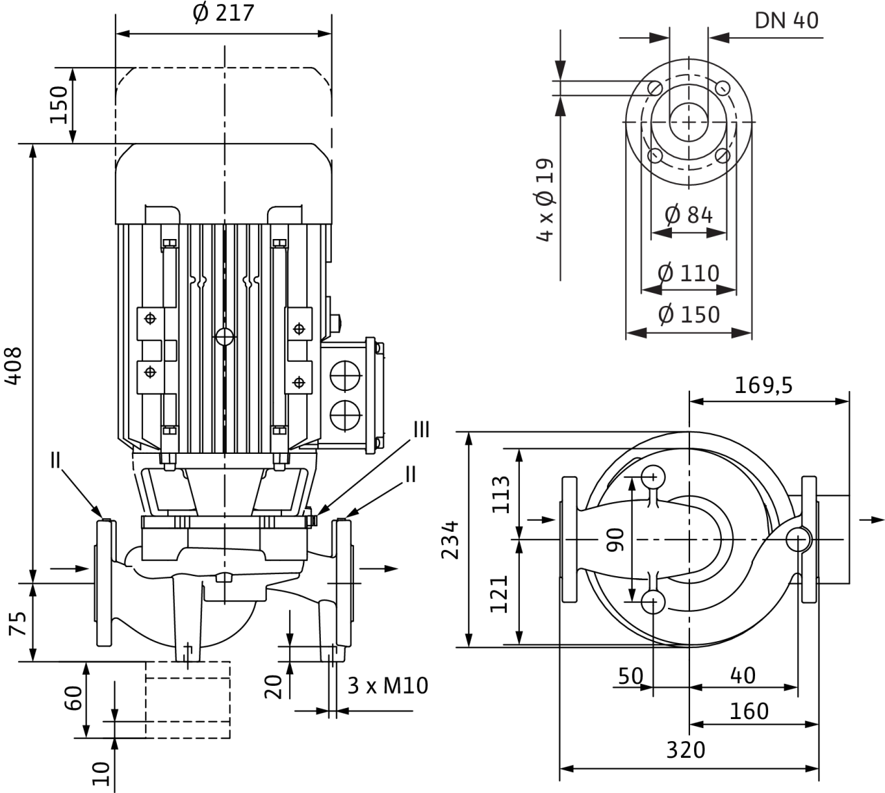 Корпус с опорными ножками для монтажа на фундаменте, консоли по запросу; II отверстие для измерения давления R1/8; III удаление воздуха R1/8