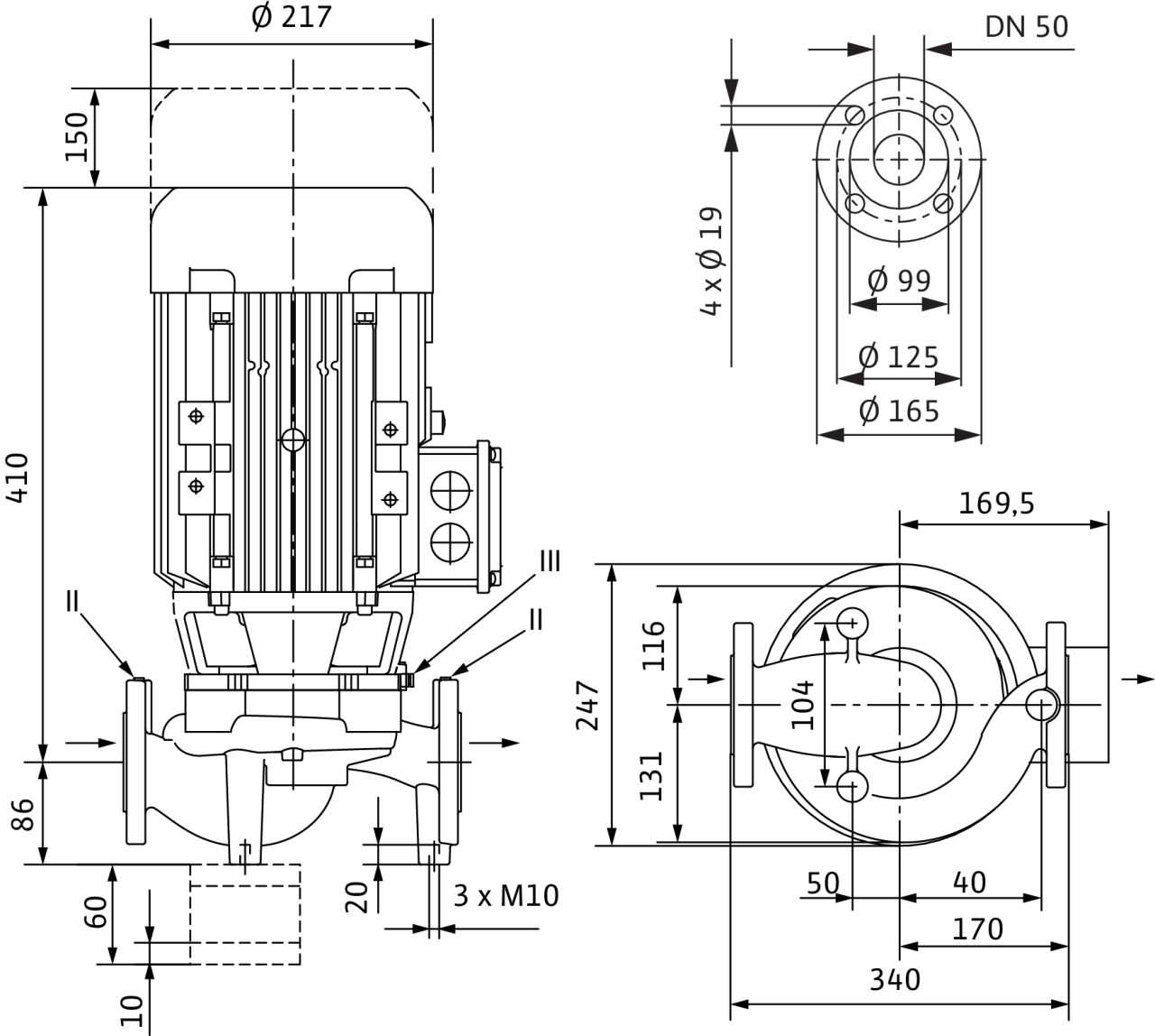 Корпус с опорными ножками для монтажа на фундаменте, консоли по запросу; II отверстие для измерения давления R1/8; III удаление воздуха R1/8