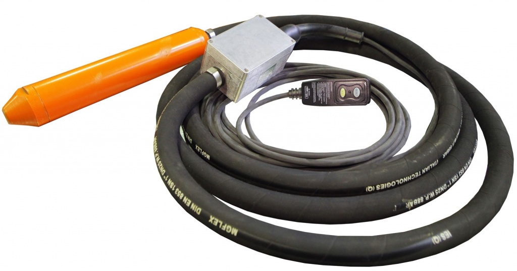 Вибратор электрический глубинный ручной со встроенным электродвигателем и встроенным инвертором, предназначен для уплотнения бетонных смесей при укладке их в монолитные конструкции с различной степенью армирования в гидротехническом строительстве, а также при изготовлении бетонных и железобетонных изделий для сборного строительства с шагом между стержнями арматуры не менее 1,5 диаметра вибронаконечника