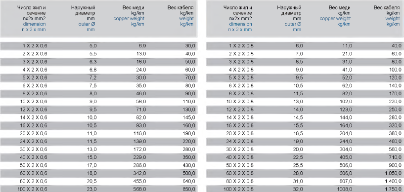 | Артикул | Название | Информация | Диаметр | Размеры | Вес меди | Вес кабеля |