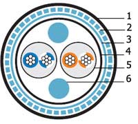 Неэкранированный кабель категории 5e для абонентских шнуров состоит из 2 витых пар свитых вместе с силовыми элементами, защищенных двойной оболочкой из ПВХ-компаунда. Заключенный в оболочку внутренний сердечник экранирован фольгой и оплеткой, защищен ПВХ-оболочкой. Кабель предназначен для применения в рамках промышленных сетей Industrial Ethernet.