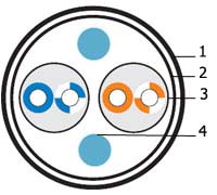 | 1 - Внешняя оболочка 2 - Внутренняя оболочка 3 - Витая пара solid 4 - Силовой элемент |