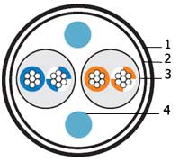 | 1 - Внешняя оболочка 2 - Внутренняя оболочка 3 - Витая пара patch 4 - Силовой элемент |