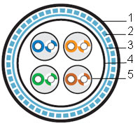 Неэкранированный кабель категории 5e состоит из 4 витых пар свитых вместе, защищенных двойной оболочкой из ПВХ-компаунда. Заключенный в оболочку внутренний сердечник экранирован фольгой и оплеткой, защищен ПВХ-оболочкой. Кабель предназначен для применения в рамках промышленных сетей Industrial Ethernet.