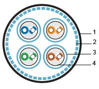 1 - Внешняя оболочка 2 - Экран-сетка 3 - Экран-фольга 4 - Витая пара solid |