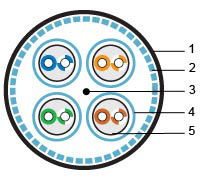 1 - Внешняя оболочка 2 - Экран-сетка 3 - Дренажный провод 4 - Экран-фольга 5 - Витая пара solid |
