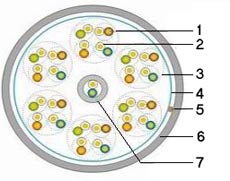 Неэкранированный многопарный медный кабель, 25 пар, категория 5, одножильный. Кабель состоит из 6-ти неэкранированных (UTP) пучков по 4 витые пары в каждом и 1-й центральной неэкранированной витой пары (4 x 6 + 1).