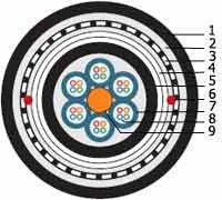 Кабель волоконно-оптический 9/125 одномодовый, 8 волокон, многомодульная конструкция (multi loose tube), усиленный, бронированный, влагостойкий, для внешней прокладки, PE |