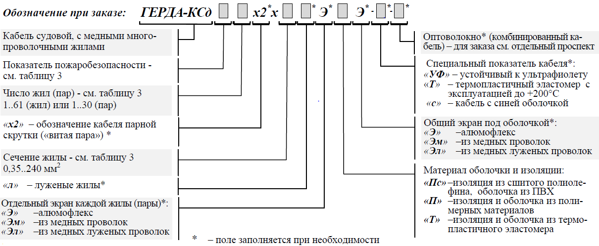 Кабель Судовой универсальный ГЕРДА-КСд по ТУ 3586-009-76960731-2007 – контрольный, управления, монтажный, силовой, связи, в том числе не распространяющий горение «нг», «нг-LS», «нг-HF» и огнестойкий «нг-FR» и «нг-FRHF», масло-бензостойкий, стойкий к воздействию соли и ультрафиолета «УФ»