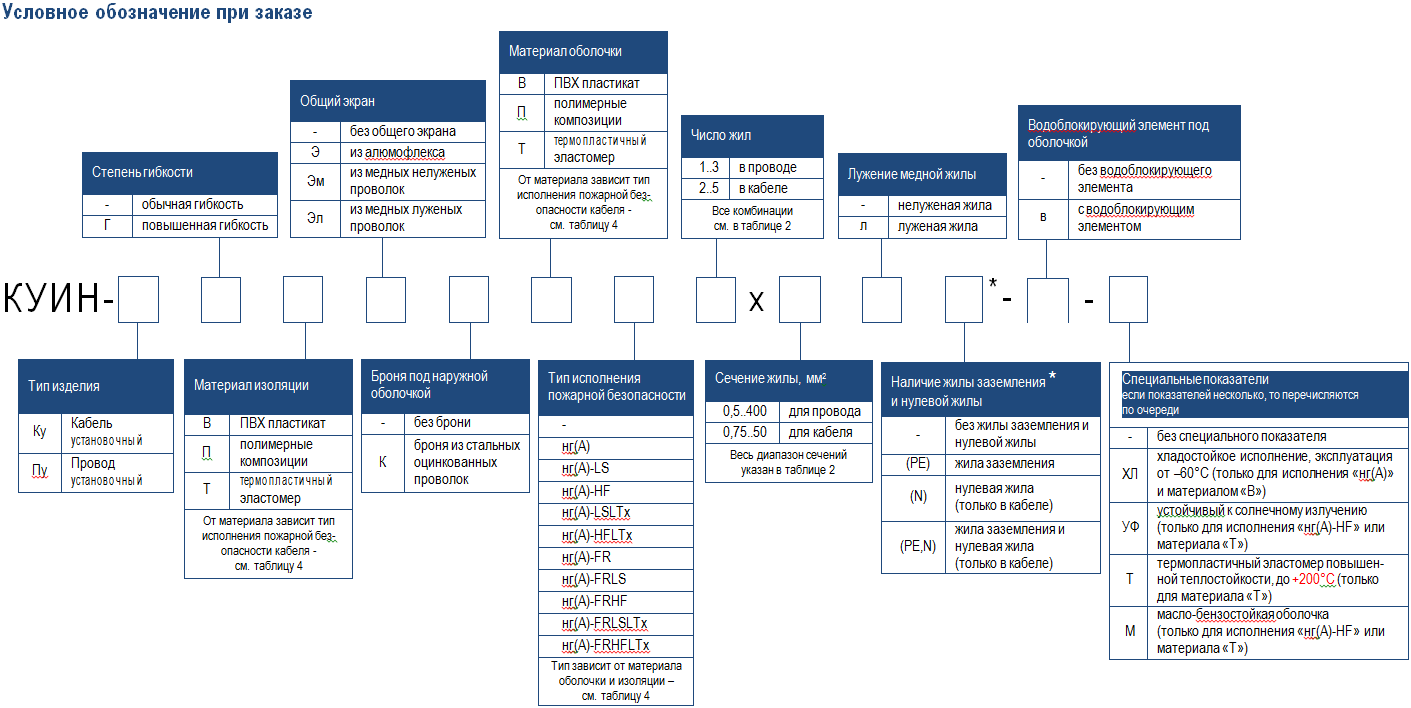 * в кабелях с жилой заземления меньшего сечения через знак сложения добавляют число и номинальное сечение жилы заземления. Например: КУИН-КуГВВнг (А) 3х25 + 1х16 (PE). В 3-х, 4-х и 5-и жильных кабелях допускается жила заземления сечением 16м м² при основных жилах сечением 25 и 35м м², и жила заземления сечением 25м м² при основных жилах сечением 50м м²