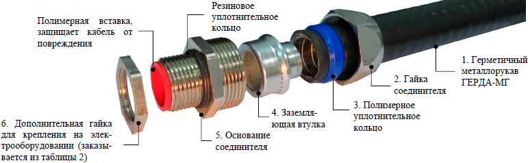 При помощи соединителей ГЕРДА-СГ металлорукав можно надежно закрепить на электрооборудовании (коробки соединительные, трубы, оболочки аппаратов, кабельные лотки и т.д.), при этом сохраняется степень защиты от внешних воздействий IP67.