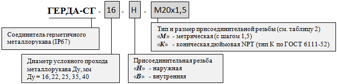 Код заказа соединителя ГЕРДА-СГ Н — наружная резьба В — внутренняя резьба М — метрическая (1) резьба К — коническая дюймовая NPT (2) |