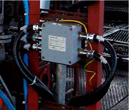 ↑ Взрывозащищенная соединительная коробка ГЕРДА-КСА с установленными взрывозащищенными кабельными вво- дами типа КМ (с внутренней резьбой). В вводы КМ вкру- чены соединители ГЕРДА-СГ с герметичным металлорука- вом ГЕРДА-МГ. Более подробную информацию можно получить из проспекта «Заказные взрывозащищенные ко- робки ГЕРДА-КСА».