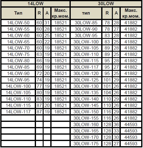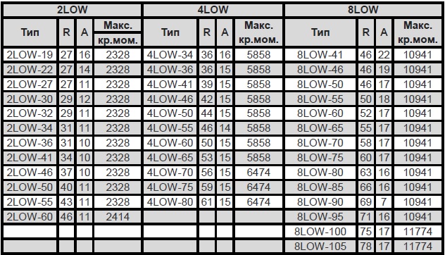 Для каждой силовой головки модели серии LOW есть полный набор шестигранных кассет, которые подходят для большинства болтов в пределах диапазона крутящих моментов. При выборе подходящей шестигранной кассеты удостоверьтесь, что расстояние между болтом и частью оборудования больше расстояния «А». Между болтами тоже должно быть достаточно пространства. Обратите внимание на размеры «А» и «R», которые приведены в таблице.