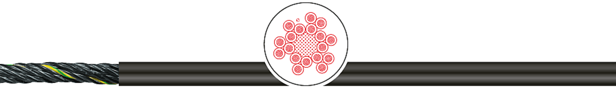 | Общая скрутка | ≤ 11 жил скручены в слои, ≥ 12 жил скрутка в пучки вокруг несущего центрального элемента |