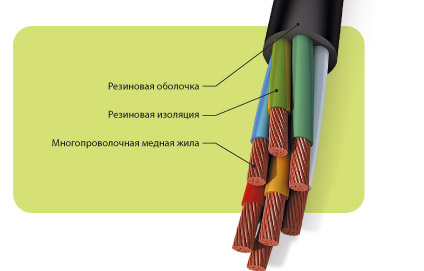 Токопроводящая жила — медная гибкая. Резиновая изоляция. Изоляция жилы заземления желто-зеленого цвета.