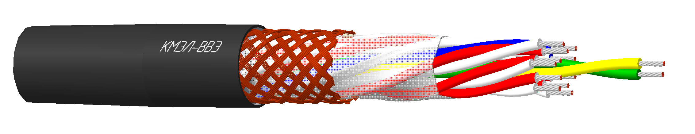 Кабели с медными или медными лужеными токопроводящими жилами, с общим экраном, небронированные. Кабели монтажные электрические КМЭЛ, предназначены для межприборного монтажа электрических устройств, работающих при номинальном напряжении до 500 В включительно частотой до 400 Гц или постоянном напряжении до 750 В включительно. «М» - медная токопроводящая жила, «без обозначения» - медная луженая токопроводящая жила, «В» - изоляция (и (или) оболочка) из поливинилхлориднго пластиката,«П» - полимерная композиция, не содержащая галогенов,«Пс» - полиэтилен сшитый,«Э» - экран в виде оплетки из медных проволок.