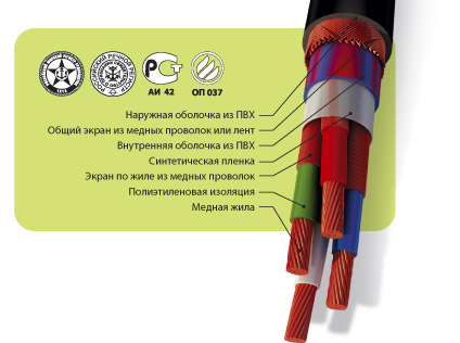С медными жилами, с поливинилхлоридной изоляцией, в ПВХ оболочке, в общем экране |