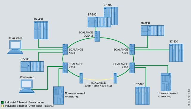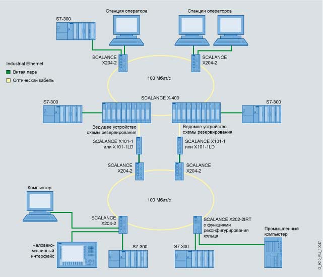 Одиночные удаленные сетевые терминалы могут подключаться к конвертору SCALANCE X-100 оптическим кабелем. Конверторы могут использоваться в резервированных кольцевых структурах, а также для организации соединений управления резервированием.