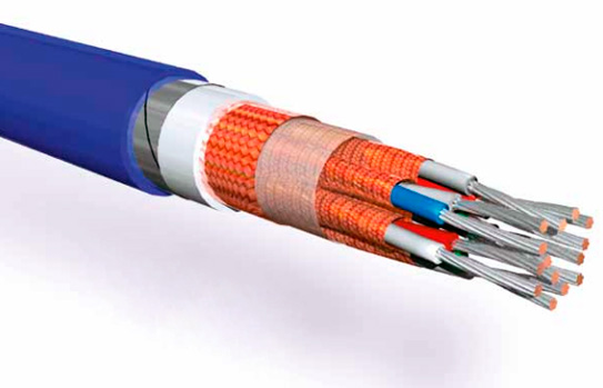 Кабель с однопроволочными токопроводящими жилами из медных проволок, с изоляцией и оболочкой из полимерных материалов, не содержащих галогенов, не распространяющий горение при групповой прокладке по категории А и не выделяющий коррозионно-активных газообразных продуктов при горении и тлении, с пятью индивидуально экранированными жилами (экран в виде оплетки или обмотки из медных проволок), с общим экраном в виде оплетки или обмотки из медных проволок, с водоблокирующими элементами, с броней из стальных оцинкованных лент, с круглым поперечным сечением и подложкой под броней, полученной методом экструзии, с негигроскопичными заполнителями.