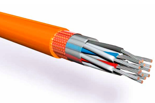 Кабель с многопроволочными токопроводящими жилами из медных луженых проволок, с изоляцией и оболочкой из полимерных материалов пониженной пожароопасности, с пониженным дымо- и газовыделением, не распространяющий горение при групповой прокладке по категории А, с общим экраном в виде оплетки или обмотки из медных проволок, без брони.