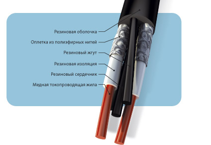 Изолированные резиной токопроводящие жилы кабеля оплетены синтетическими нитями и скручены с двумя междужильными заполнителями вокруг резинового сердечника.