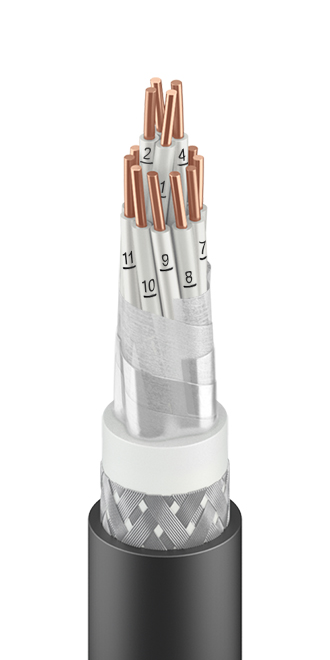 Кабель для систем промышленной автоматики, с токопроводящими жилами из медных проволок с заполнением сердечника, с изоляцией и оболочкой из полимерных материалов, с индивидуально экранированными элементами и броней из стальных оцинкованных лент.