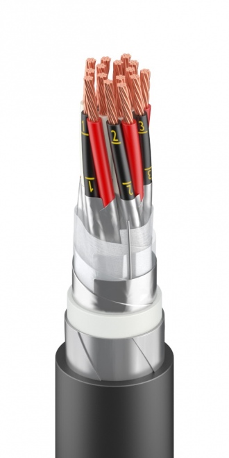 Кабель для систем промышленной автоматики, с токопроводящими жилами из медных проволок с изоляцией и оболочкой из полимерных материалов, с общим экраном, с броней из стальных оцинкованных проволок.