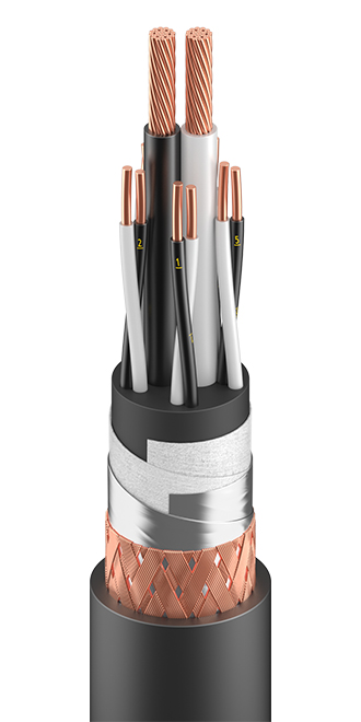 Кабель для систем промышленной автоматики, с комбинированными токопроводящими жилами из медных проволок с изоляцией и оболочкой из полимерных материалов, с общим экраном без брони.