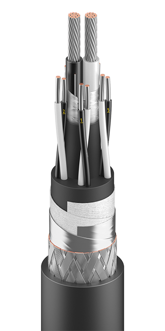 Кабель для систем промышленной автоматики, с комбинированными токопроводящими жилами из медных лужёных проволок с изоляцией и оболочкой из полимерных материалов, с общим экраном без брони.