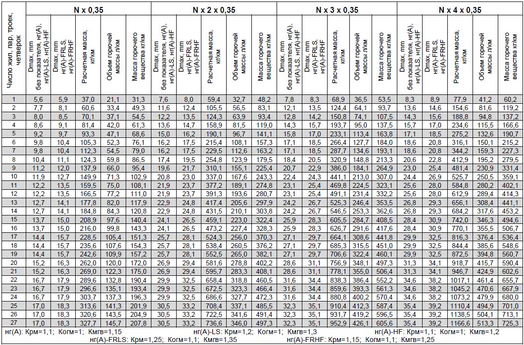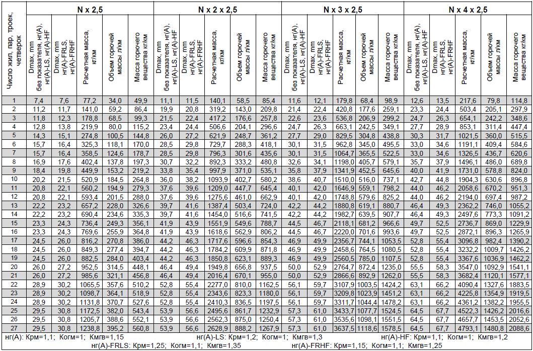 Определение величин показателей для кабелей в различных исполнениях по пожарной безопасности следует производить умножением базового показателя на соответствующий коэффициент:
