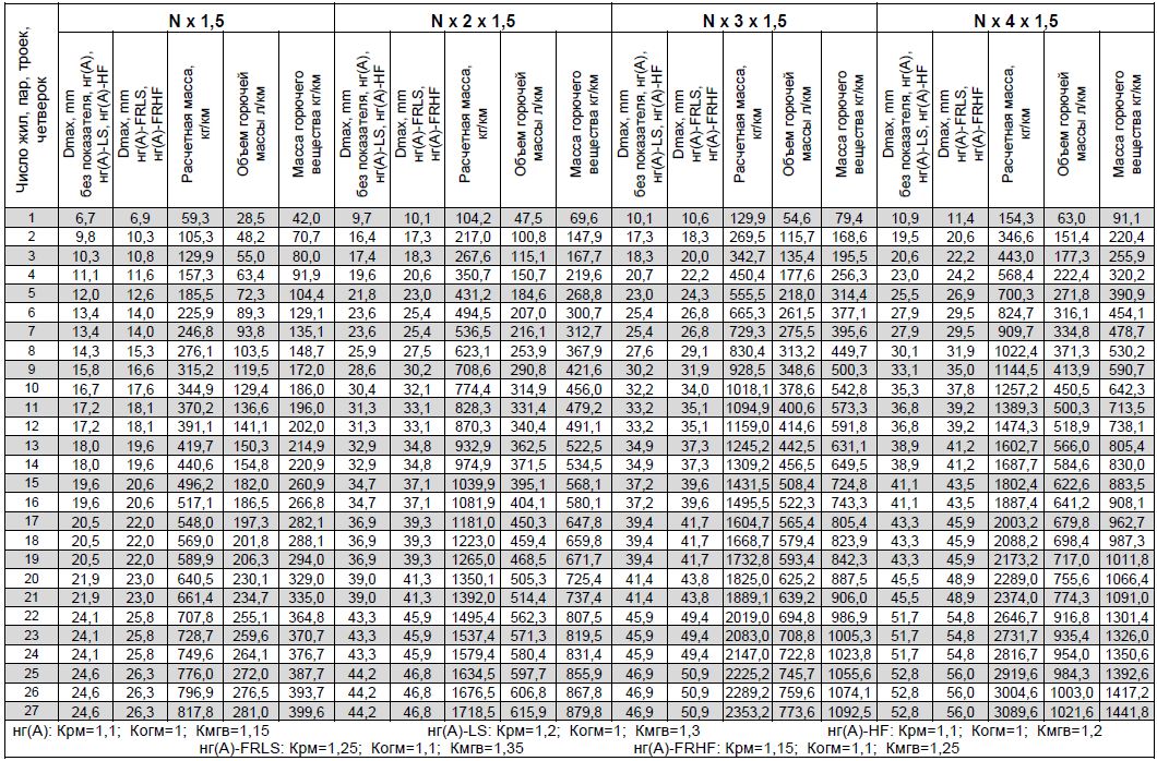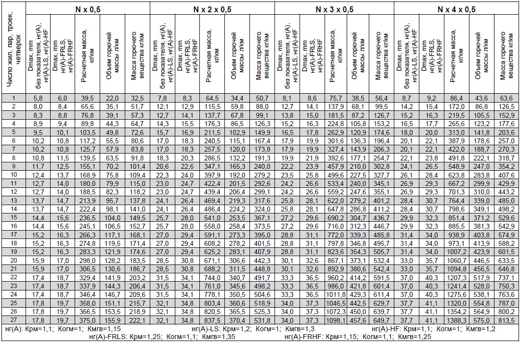 При работе с таблицей следует учитывать, что показатели приведены для кабелей с экранами, выполненными из фольгированного материала, расчетная масса, объем горючей массы и масса горючего вещества приведены в таблице для кабелей общепромышленного исполнения, не распространяющих горение при одиночной прокладке (без обозначения показателя пожарной опасности).