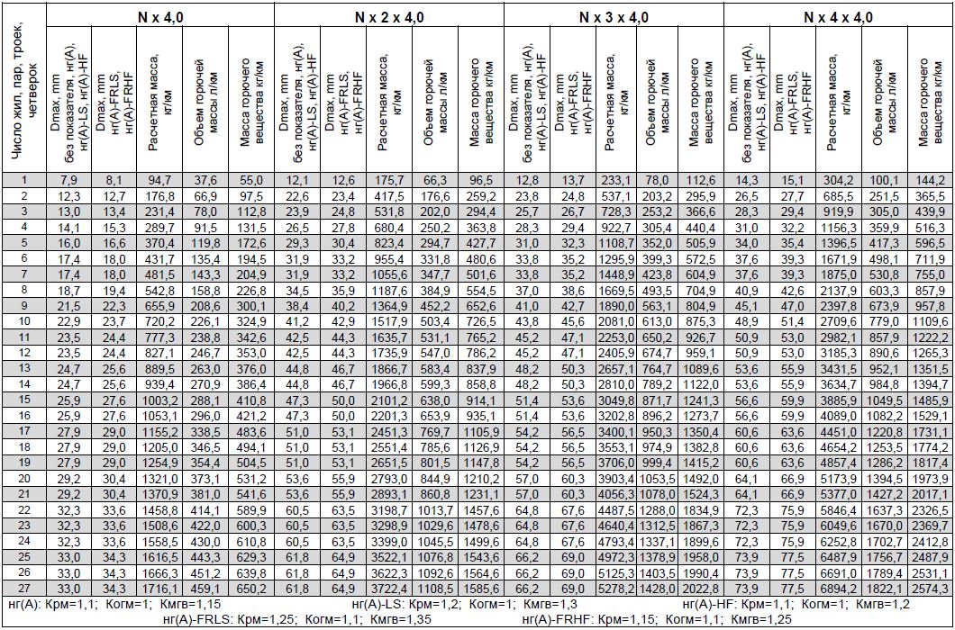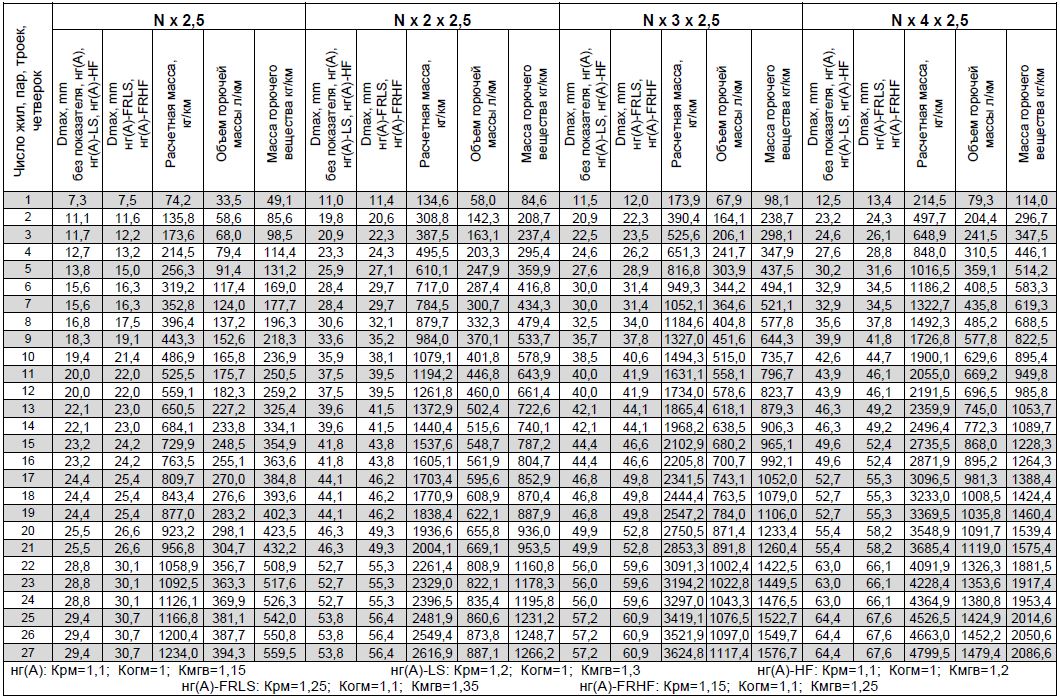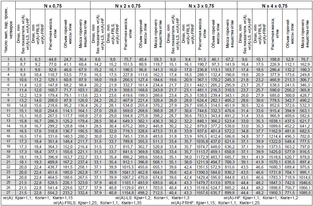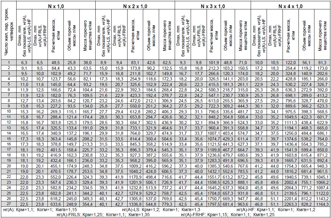При работе с таблицей следует учитывать, что показатели приведены для кабелей с экранами, выполненными из фольгированного материала, расчетная масса, объем горючей массы и масса горючего вещества приведены в таблице для кабелей общепромышленного исполнения, не распространяющих горение при одиночной прокладке (без обозначения показателя пожарной опасности).