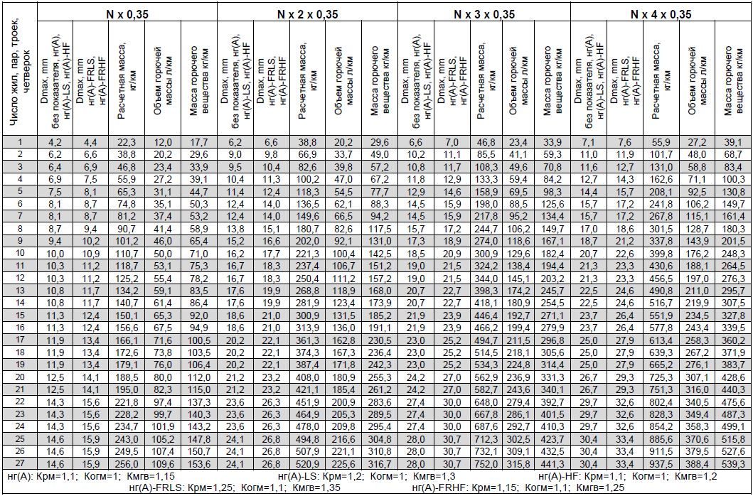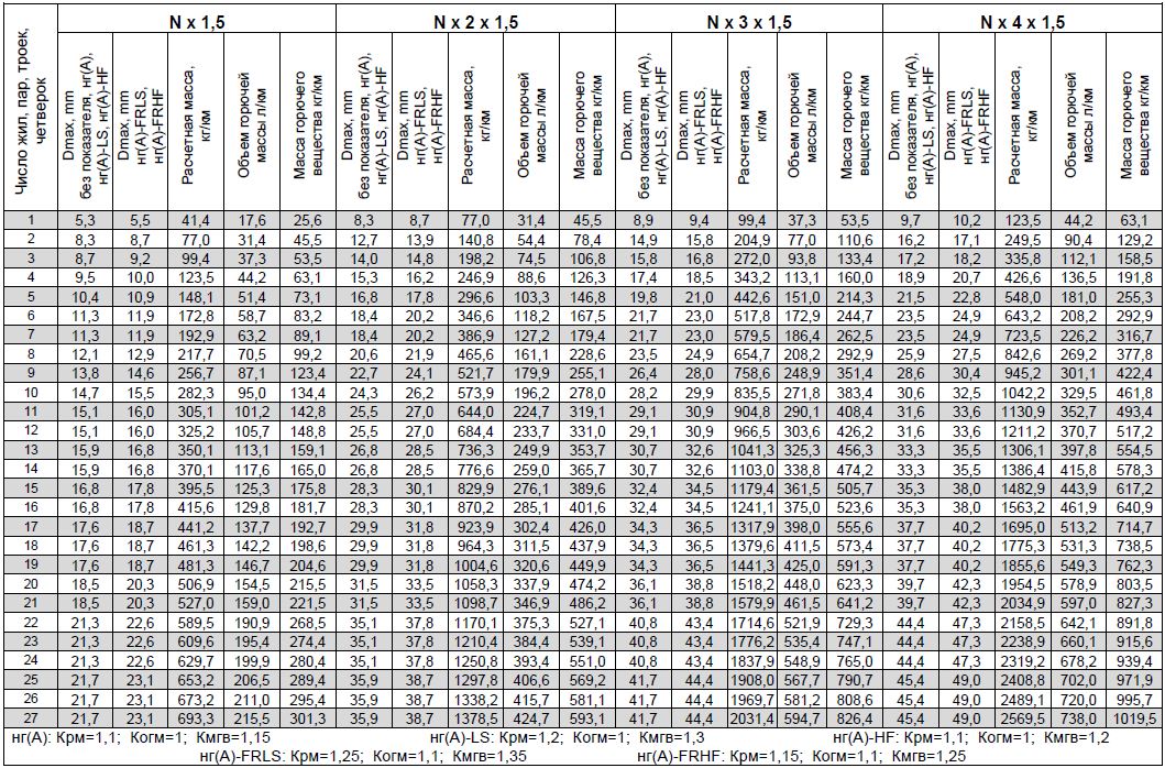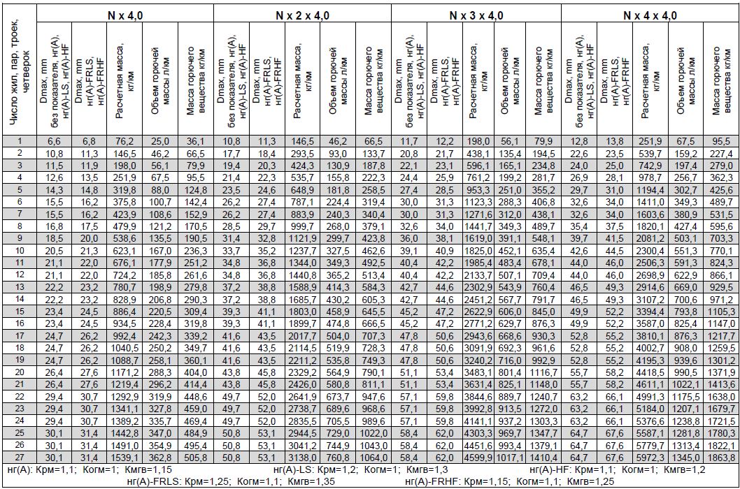 При работе с таблицей следует учитывать, что показатели приведены для кабелей с экранами, выполненными из фольгированного материала, расчетная масса, объем горючей массы и масса горючего вещества приведены в таблице для кабелей общепромышленного исполнения, не распространяющих горение при одиночной прокладке (без обозначения показателя пожарной опасности).