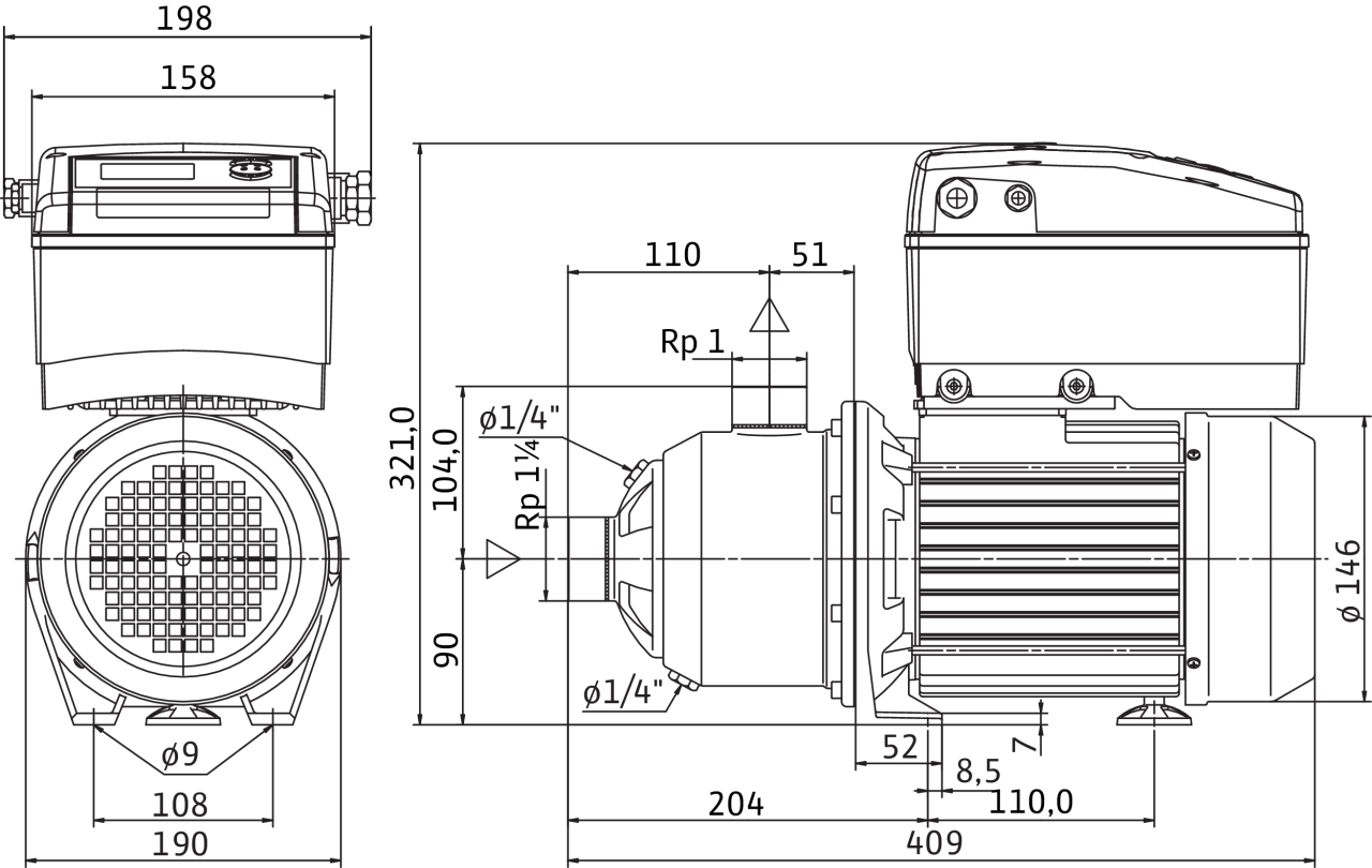 Многоступенчатый нормальновсасывающий горизонтальный высоконапорный центробежный насос блочного типа с горизонтальным всасывающим и вертикальным напорным патрубком и встроенным частотным преобразователем с воздушным охлаждением. Встроенный частотный преобразователь позволяет осуществлять плавную регулировку частоты вращения, давления и ПИД-регулировку.