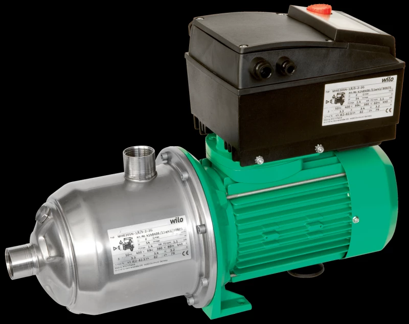 Многоступенчатый нормальновсасывающий горизонтальный высоконапорный центробежный насос блочного типа с горизонтальным всасывающим и вертикальным напорным патрубком и встроенным частотным преобразователем с воздушным охлаждением. Встроенный частотный преобразователь позволяет осуществлять плавную регулировку частоты вращения, давления и ПИД-регулировку.