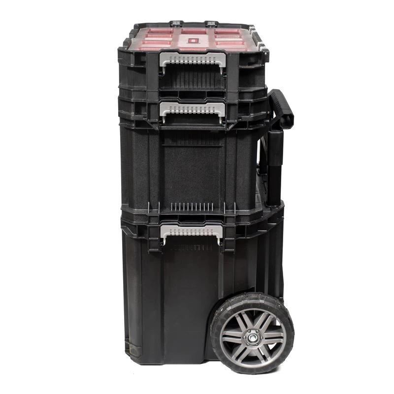- Модульная система из прочного полипропилена, состоящая из ящика-тележки с объемным отсеком, вместительного съемного ящика для габаритного инструмента и съемного органайзера для мелких деталей, фурнитуры, метизов