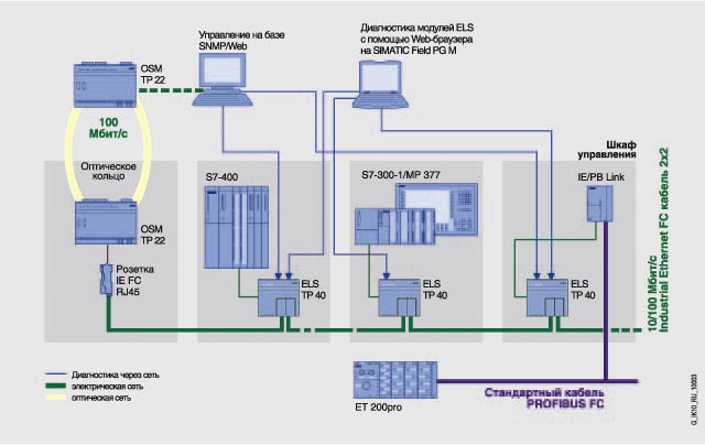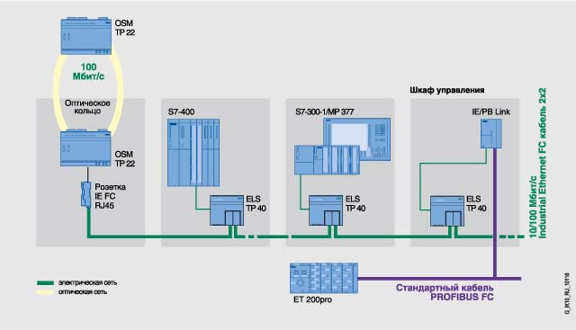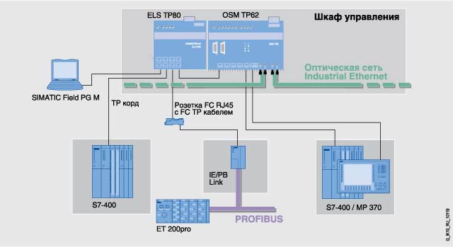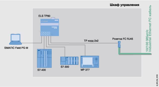 Как правило, модули ELS монтируются в одном шкафу управления с подключаемыми к Industrial Ethernet станциями. Шкафы управления подключаются к Industrial Ethernet по линейной структуре.