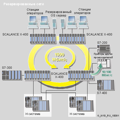 Для повышения надежности передачи данных в сети коммутаторами X-400 используются оптические кольцевые топологии. Коммутаторы X-400 оснащены встроенной системой управления резервными маршрутами передачи данных, которая осуществляет непрерывный мониторинг целостности оптического кольца. При обнаружении повреждения оптического кольца коммутатор SCALANCE X-400 активирует резервные маршруты передачи данных. На выполнение этих операций он тратит не более 0.3 с. Обмен данными в кольце с коммутаторами SCALANCE X-400 может происходить на скорости 1000 Мбит/с. В кольцах с коммутаторами SCALANCE X-400 и модулями SCALANCE X-200 или OSM/ESM обмен данными выполняется на скорости 100 Мбит/с.