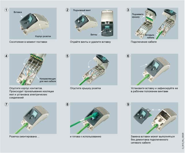 Industrial Ethernet FC TP кабель 4 x 2 подключается непосредственно к модульному соединителю IE FC RJ45. Подключение сетевых станций и сетевых компонентов выполняется через одно или два гнезда RJ45 съемной вставки. Вся конструкция в сборе соответствует категории 6 международных стандартов ISO/IEC 11801 и EN 50173.